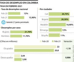 De acuerdo con las cifras del Departamento Administrativo Nacional de Estadística (Dane), la tasa de desempleo de febrero de 2021 se ubicó en 15,9%, lo que significó un aumento de 3,7 puntos porcentuales frente al mismo periodo de 2020 (12,2%).