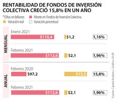 Capital Analytics, la fintech colombiana que ofrece servicios de información y análisis de instrumentos de inversión, reveló, en su último estudio, que la rentabilidad de los Fondos de Inversión Colectiva (FIC) para febrero de 2021 fue de $112,6 billones, lo que equivale aproximadamente a 10% del Producto Interno Bruto y representa un crecimiento anual de 15,8%. Además, frente al mes inmediatamente anterior, aumentó 1,96%, es decir, $2,1 billones.